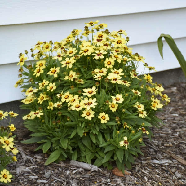- Creamy yellow flowers with bold burgundy centers pop in containers and flowerbeds.